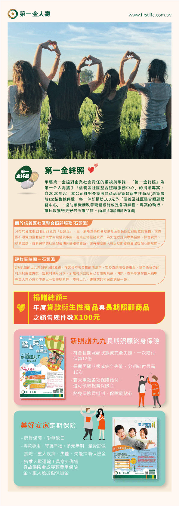 台灣預計於2026年邁入「超高齡社會」,長照需求人口將突破百萬,衛福部調查顯示,照顧者每天平均需花費11個小時,長照期間高達7.8年,國人平均保障卻不足以應付冗長的照護期間。第一金人壽以「讓每一位民眾擁有充足保障」為核心經營理念,致力於保障型商品的銷售,未來更將持續關注長照議題,包括商品設計、保戶服務、公益焦點等多元面向,發揮「政府力量有限,民間資源無窮」的石頭湯精神,讓台灣成為一個適合高齡化民眾居住的優質環境。