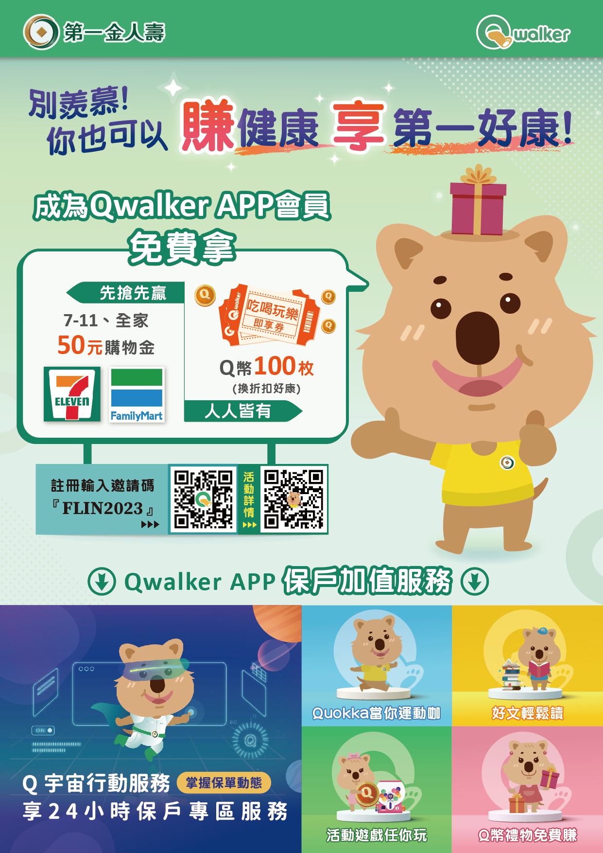 於2023/7/1-9/30,符合活動對象之資格條件者,完成Qwalker註冊輸入推薦邀請碼「FLIN2023」成為Qwalker會員,再享以下抽獎:
