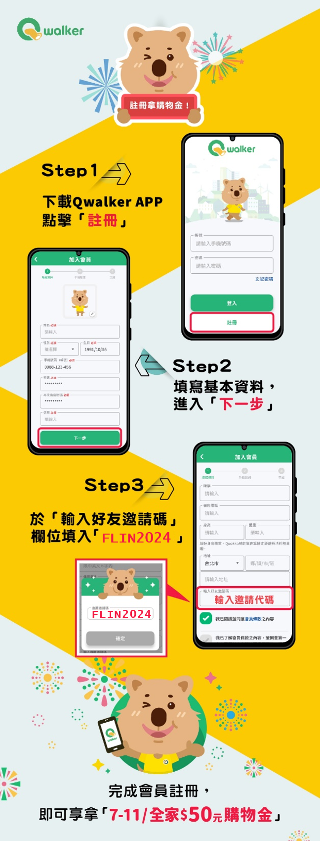 於本活動期間截至4/30前,符合活動對象之資格條件者,完成Qwalker註冊輸入推薦邀請碼「FLIN2024」成為Qwalker會員,再享以下抽獎: