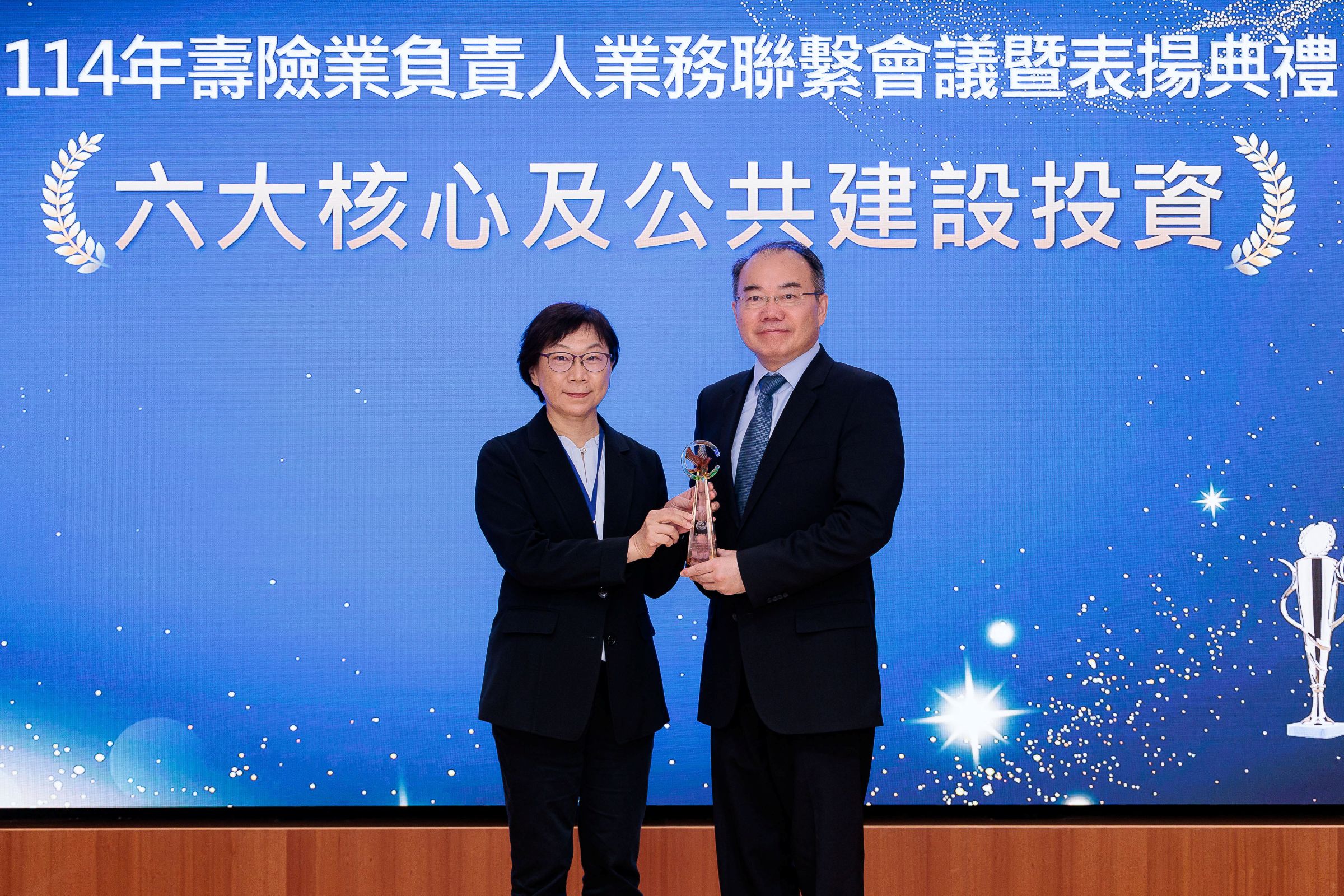 第一金人壽長期推動金融友善、落實公平待客精神,並積極配合政府政策方向,持續投資六大核心戰略產業與及公共建設領域,今年再度榮獲金融監督管理委員會頒發「114年度六大核心及公共建設投資競賽-專案投資組」獎項肯定,彰顯出第一金人壽長期支持國家公共建設、實踐企業社會責任的卓越成果。