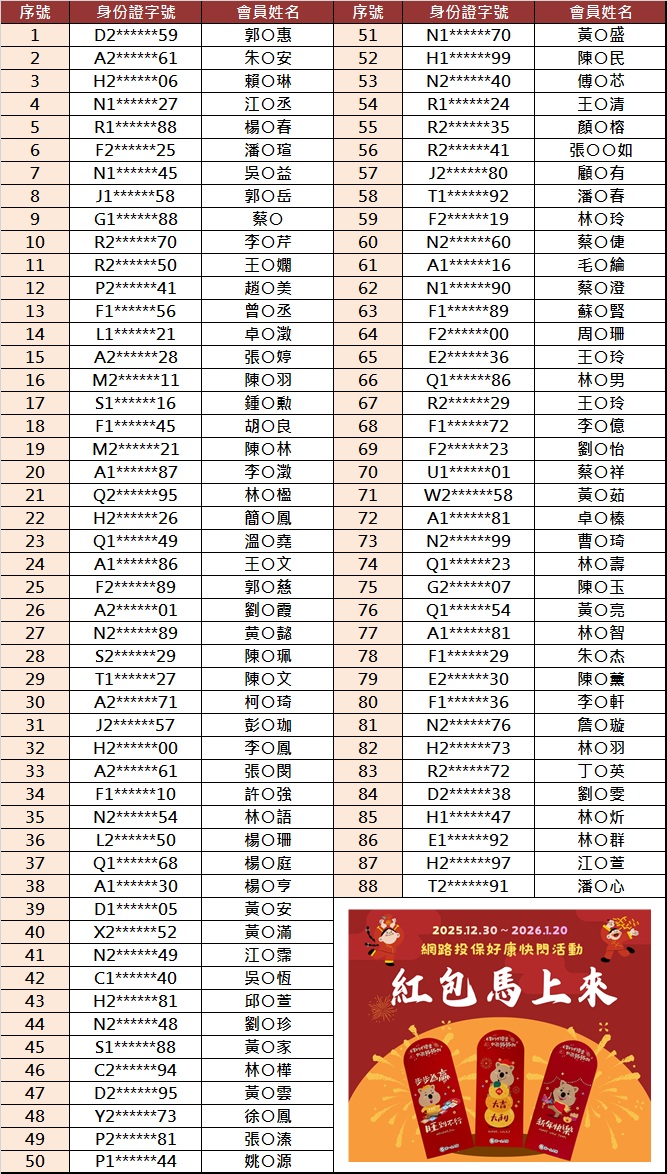 《中獎公告》網路投保【紅包馬上來】好康快閃活動中獎名單